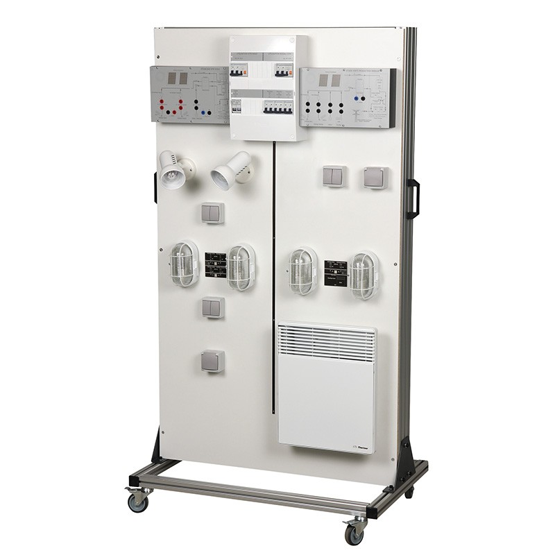 Châssis à roulettes reproduisant sur un panneau vertical des installations électriques domestiques permettant l'utilisation des sources de tensions (AC + DC) de nos centrales solaires SOL-1 à SOL-5.