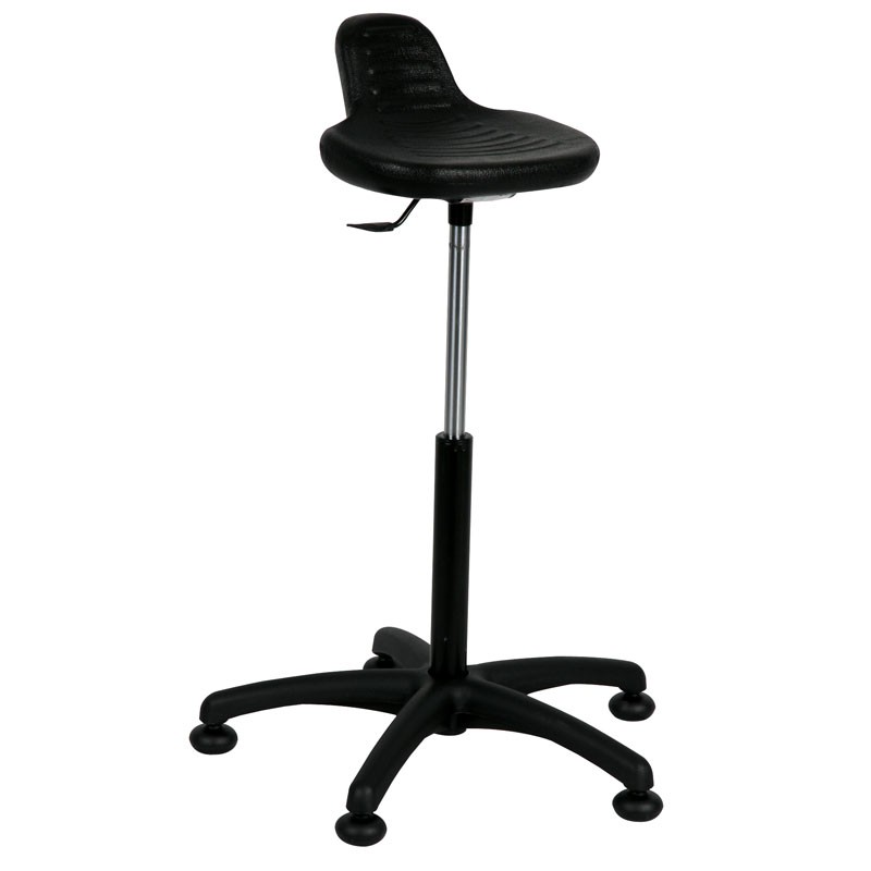 Chaise assis-debout 5 branches avec patins. Pivotante, réglable en hauteur par colonne à gaz. Assise polyuréthane ergonomique.